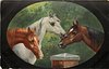 white, dark-brown & light-brown horses, green leafy background stone capped, cornerpost in foreground - oval inset, black surround