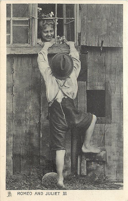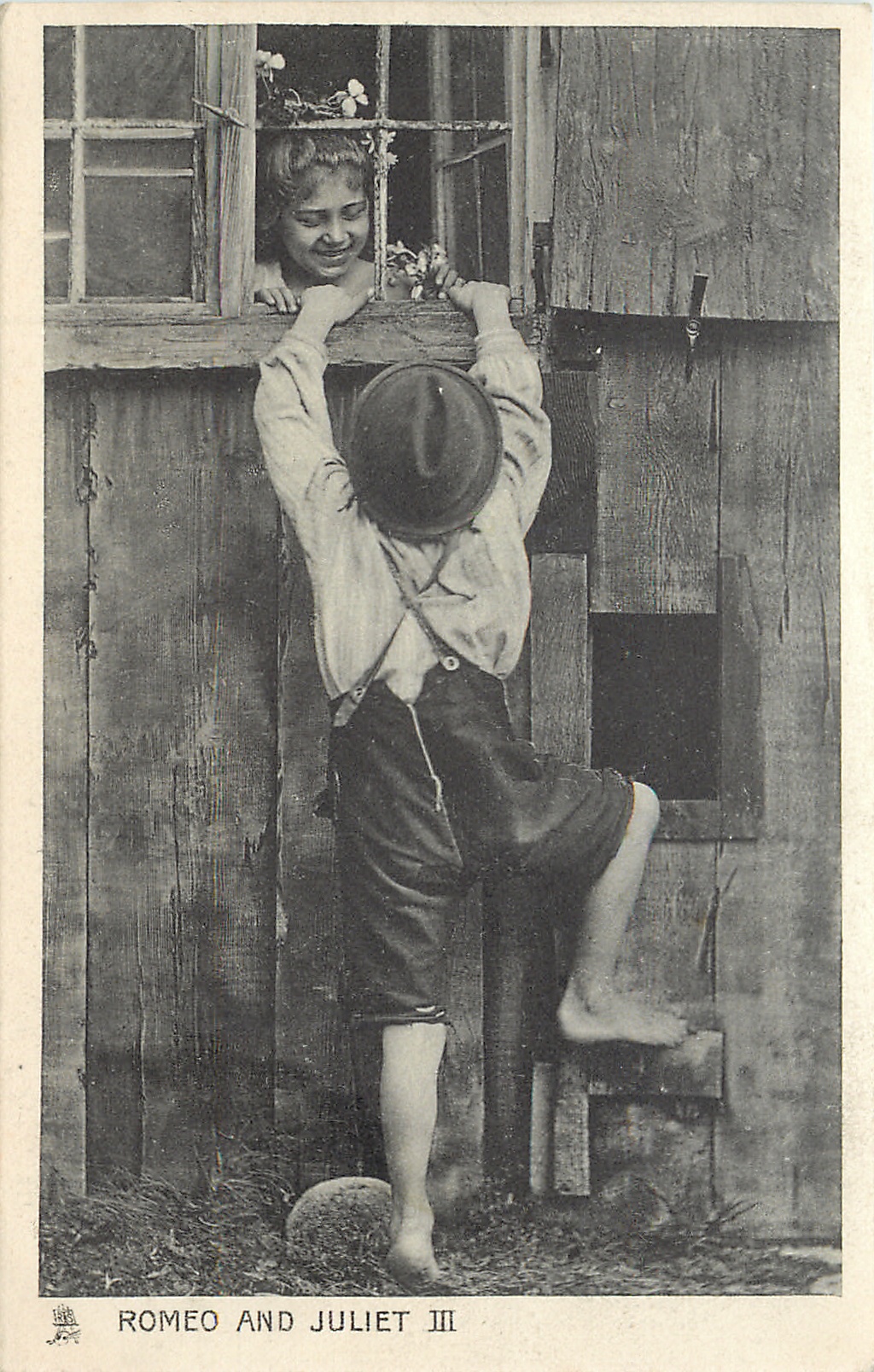 ROMEO AND JULIET III. - children as adults, boy has right foot up on ledge, girl looks down
