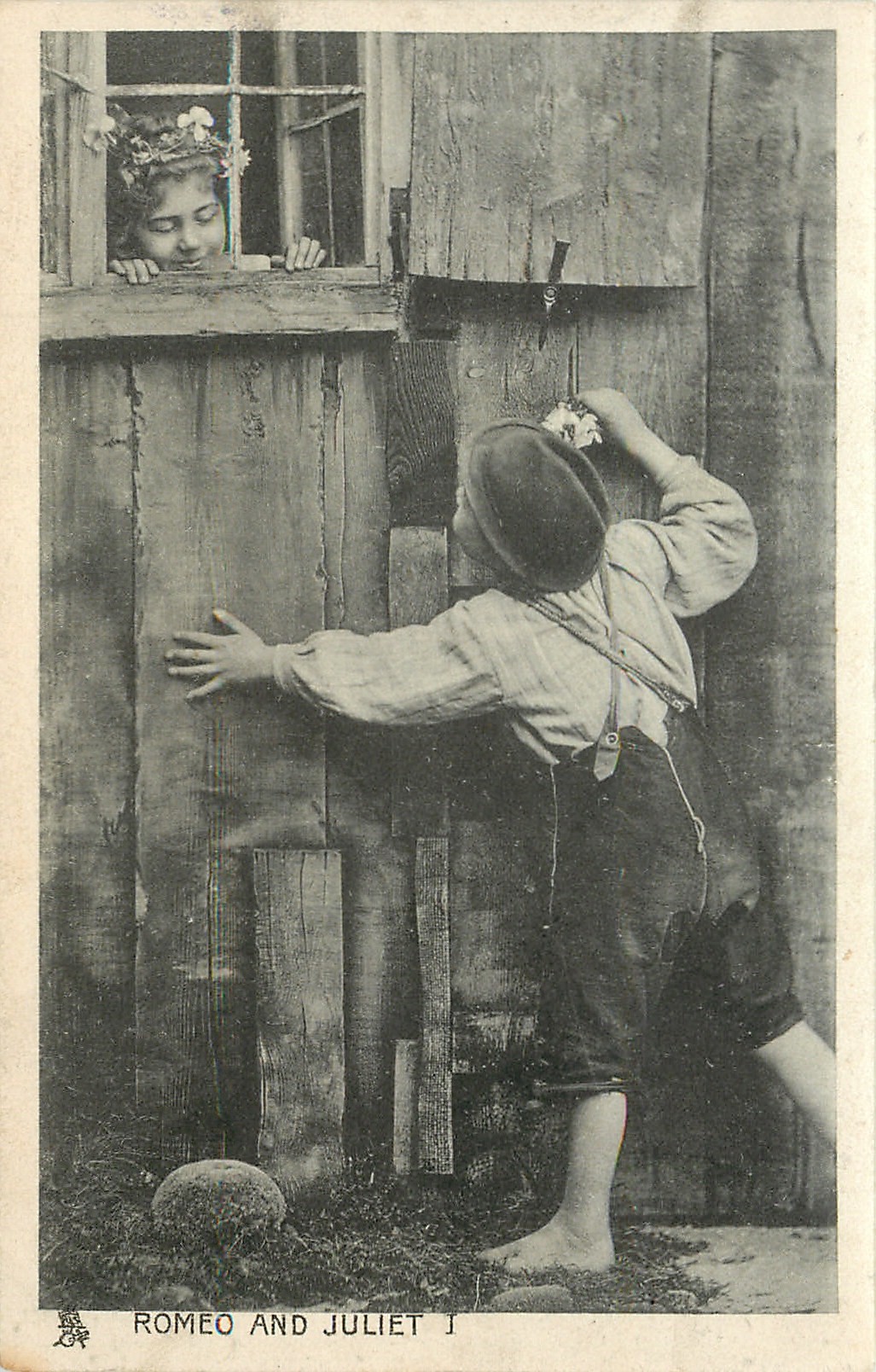 ROMEO AND JULIET I. - children as adults, boy approaches from right, girl peeks out of window