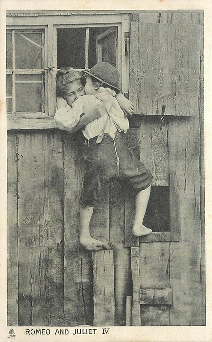 ROMEO AND JULIET IV. - children as adults, boy has climbed up, they embrace & kiss