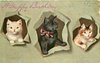 three kittens appear in holes through grey/green background, left kitten is white, middle one is black, right kitten is white/ginger/black