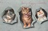three kittens in holes through grey background, left is grey/white, middle ginger, right white/ginger