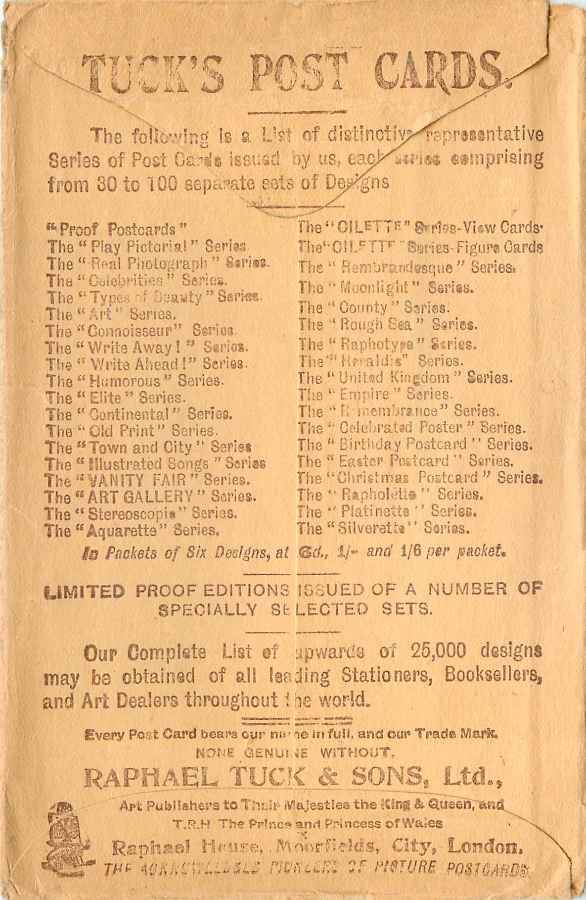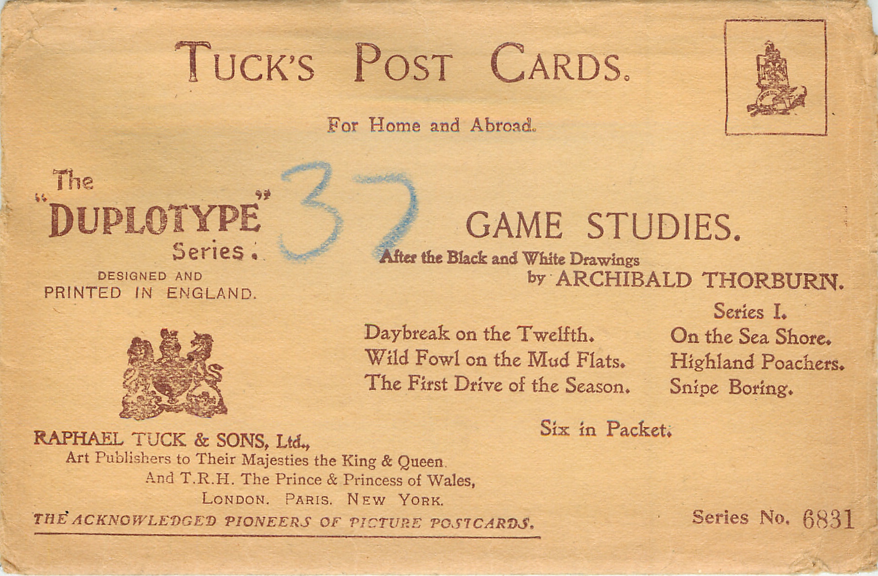 PRINTED IN ENGLAND, SERIES I., appears on packet but not on cards, packet inscribed DUPLOTYPE SERIES, shades of grey/black, AFTER THE BLACK & WHITE DRAWINGS BY ARCHIBALD THORBURN., listed in 1908/1909 & 1911/1912 & 1930 POSTCARD CatalogueS