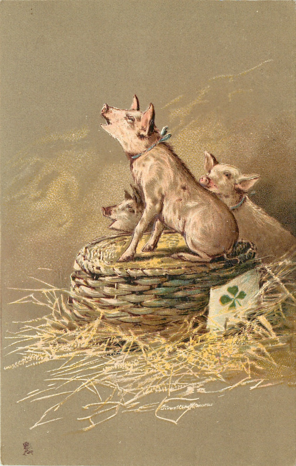 one piglet sits on overturned basket with 4 leaf clover on side, two others behind, mouths open