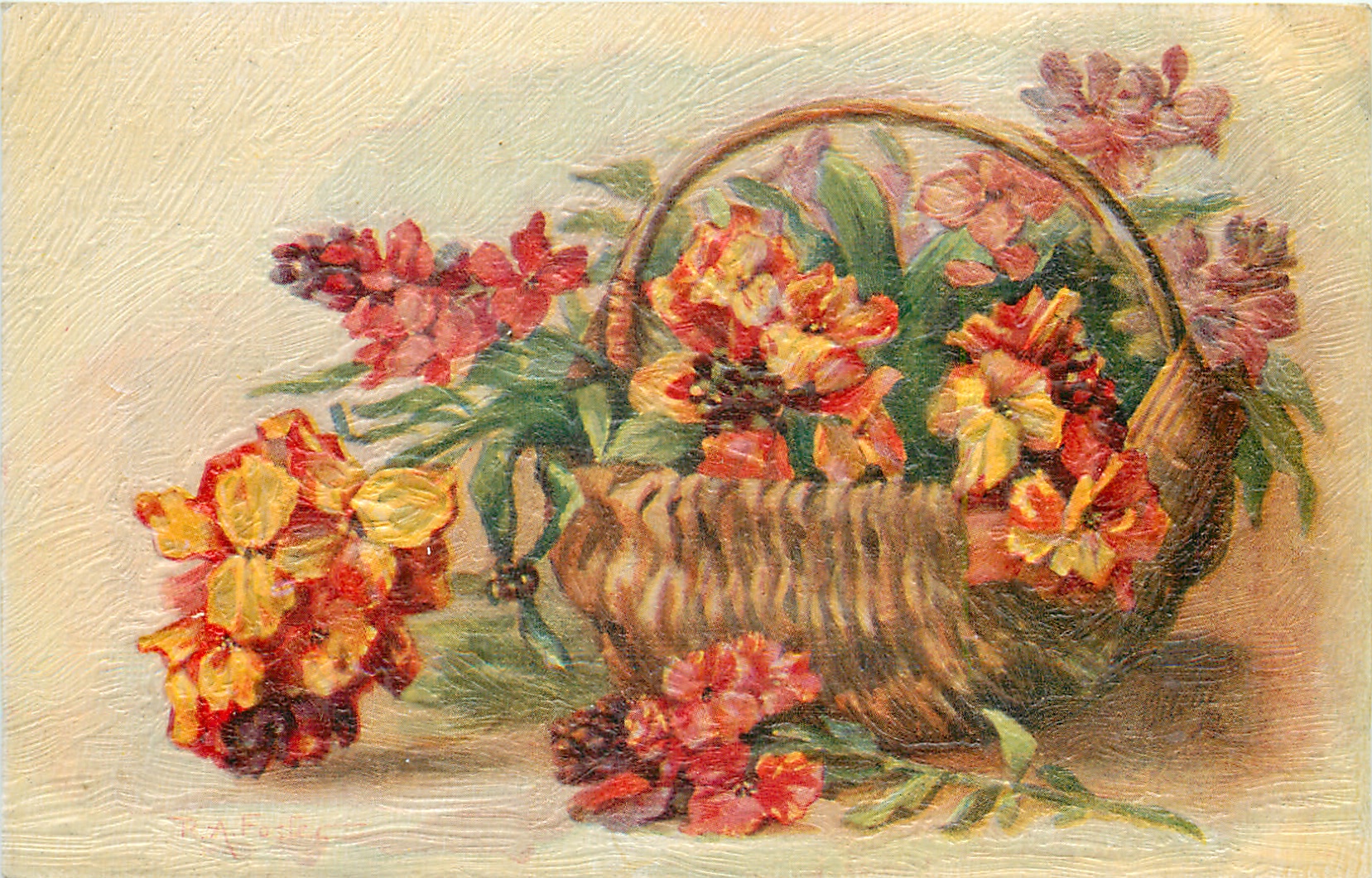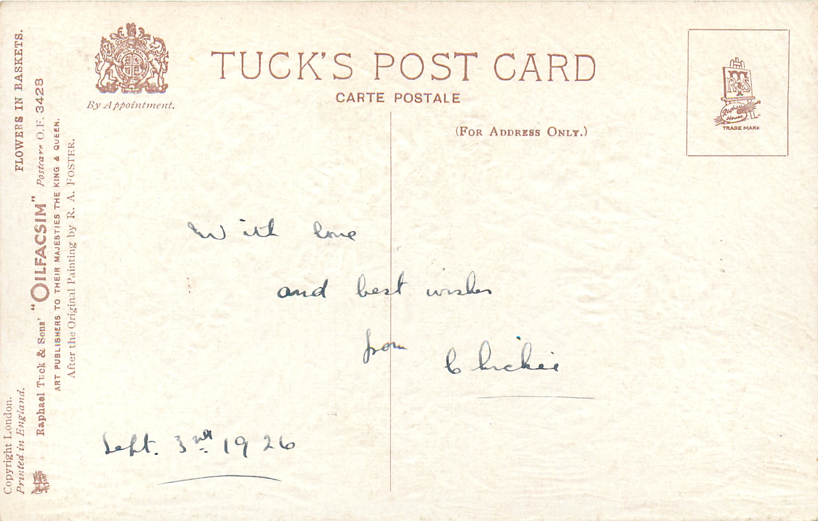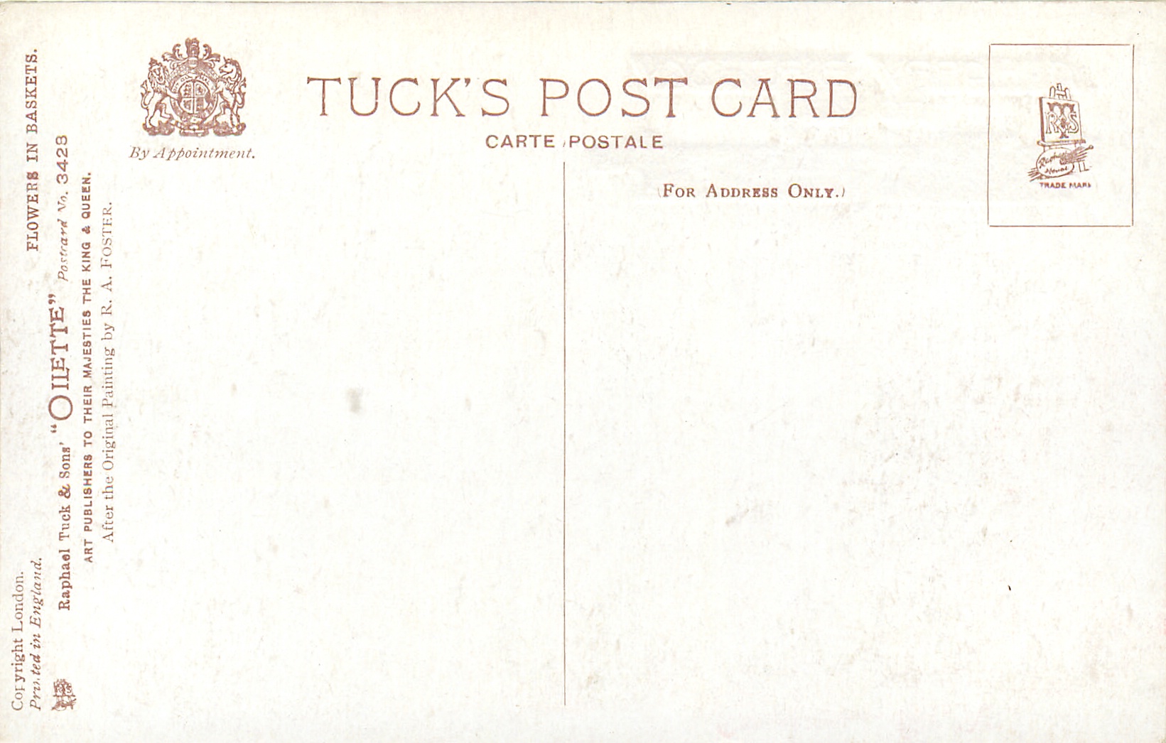 OILETTE, PRINTED IN ENGLAND, COPYRIGHT LONDON, come OILFACSIM with O.F. prefixes, come with variable greetings & verses, AFTER THE ORIGINAL PAINTING BY R.A. FOSTER. listed in 1930 Postcard Catalogue