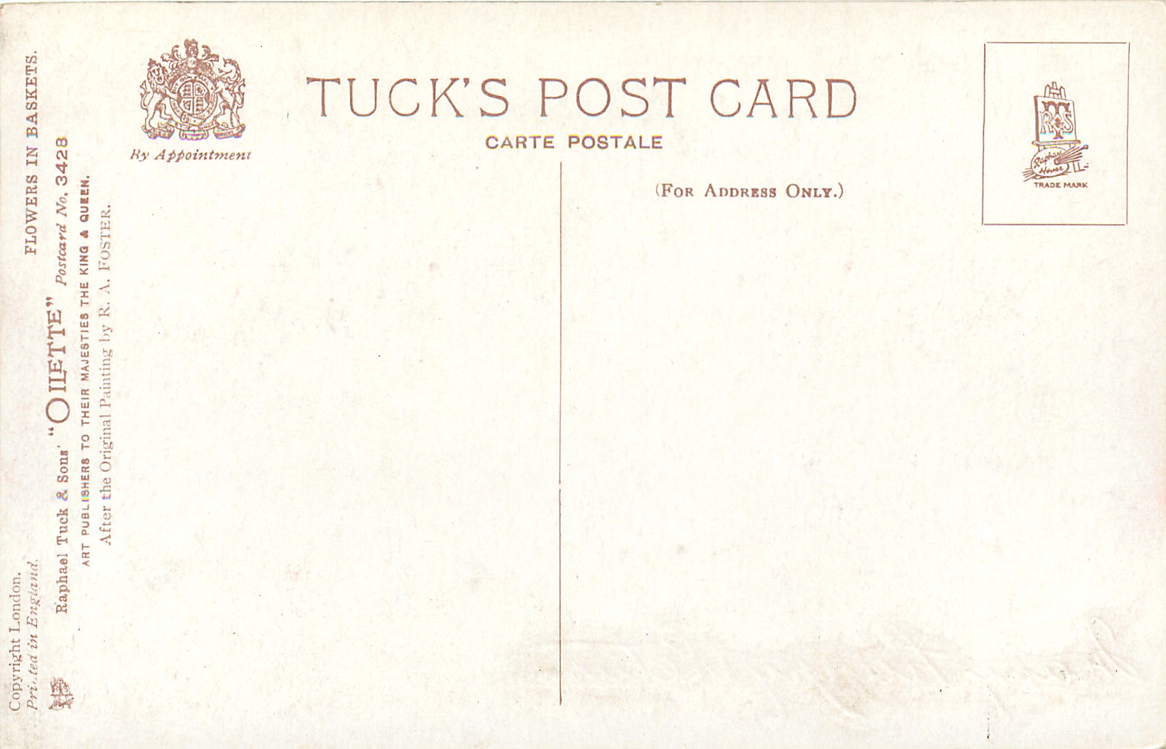 OILETTE, PRINTED IN ENGLAND, COPYRIGHT LONDON, come OILFACSIM with O.F. prefixes, come with variable greetings & verses, AFTER THE ORIGINAL PAINTING BY R.A. FOSTER. listed in 1930 Postcard Catalogue