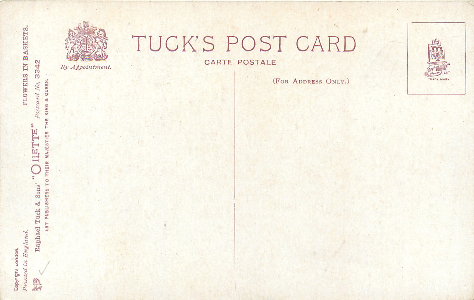 OILETTE, PRINTED IN ENGLAND, COPYRIGHT LONDON, listed in 1930 Postcard Catalogue