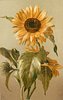 sunflower at top facing up, another mostly hidden by leaves, bud to left