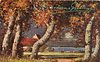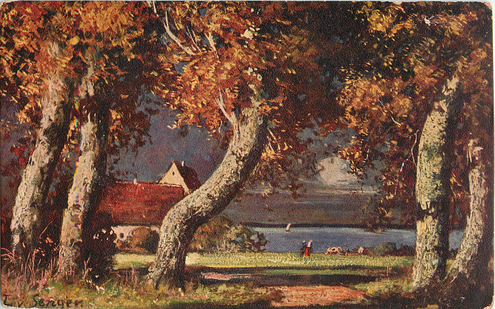 five trees, mainly trunks, lake and cottage, figure and animal near water