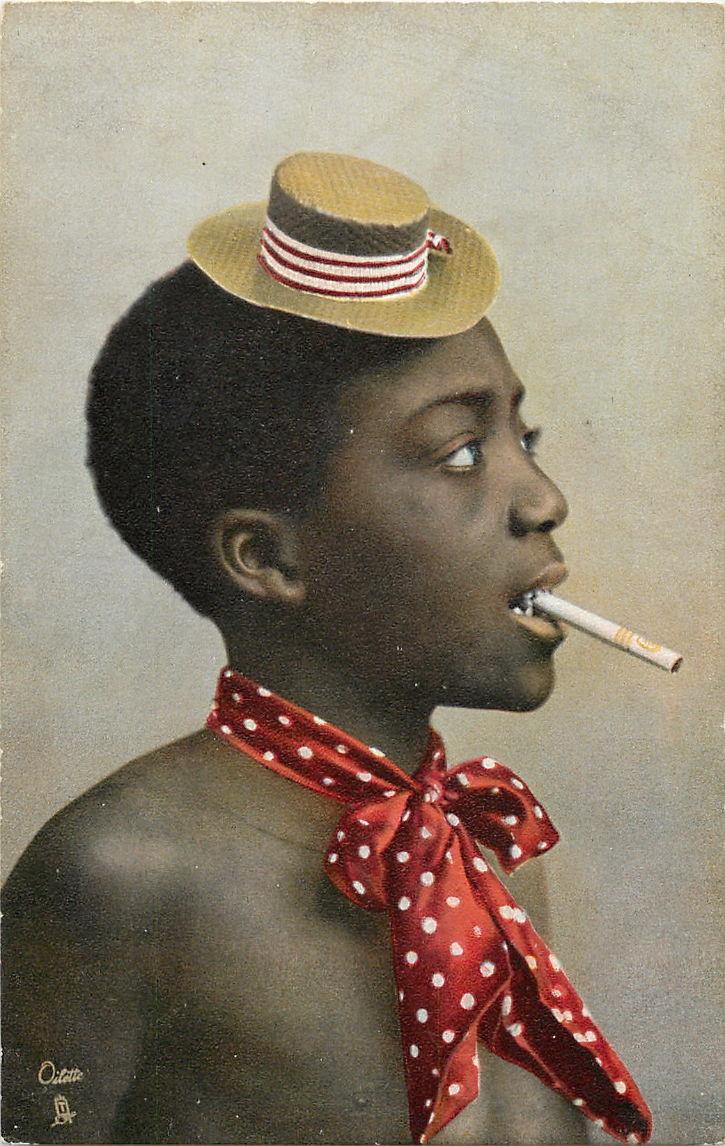 young black man with small brown hat with white and red stripes and white spotted red tie smoking cigarette facing right