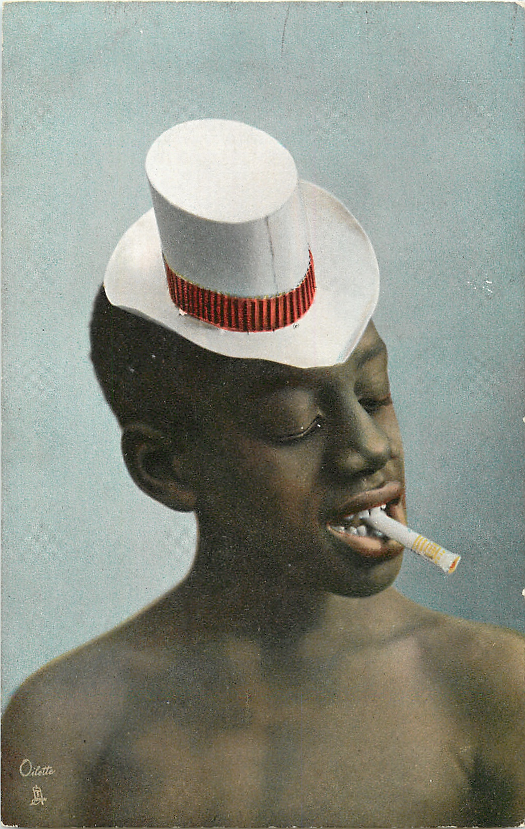 young black man white hat with red striped band and tie, unlit cigarette