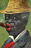 head of black man in straw hat, smoking cigar