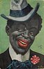 head of black man wearing carnation buttonhole, blue bow tie, blue & grey hat