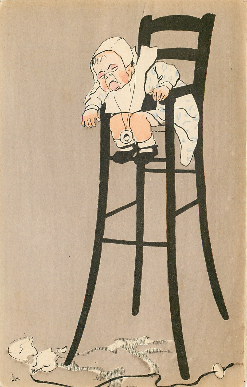 bawling baby on high chair has dropped bottle