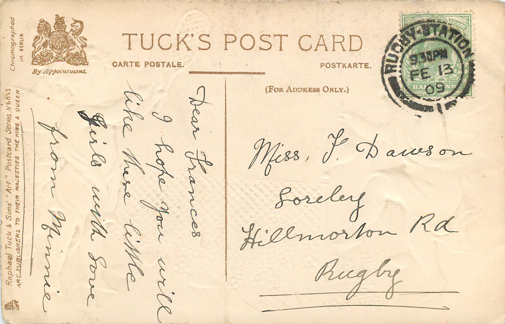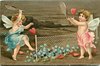 WITH LOVE AND BEST WISHES winged cherubs playing tennis with red hearts, blue robe on left, pink robe on right