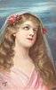 girl with red roses in hair, looking up, blue background