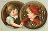 boy on right shakes hands with girl on left, both in middle of round cookies