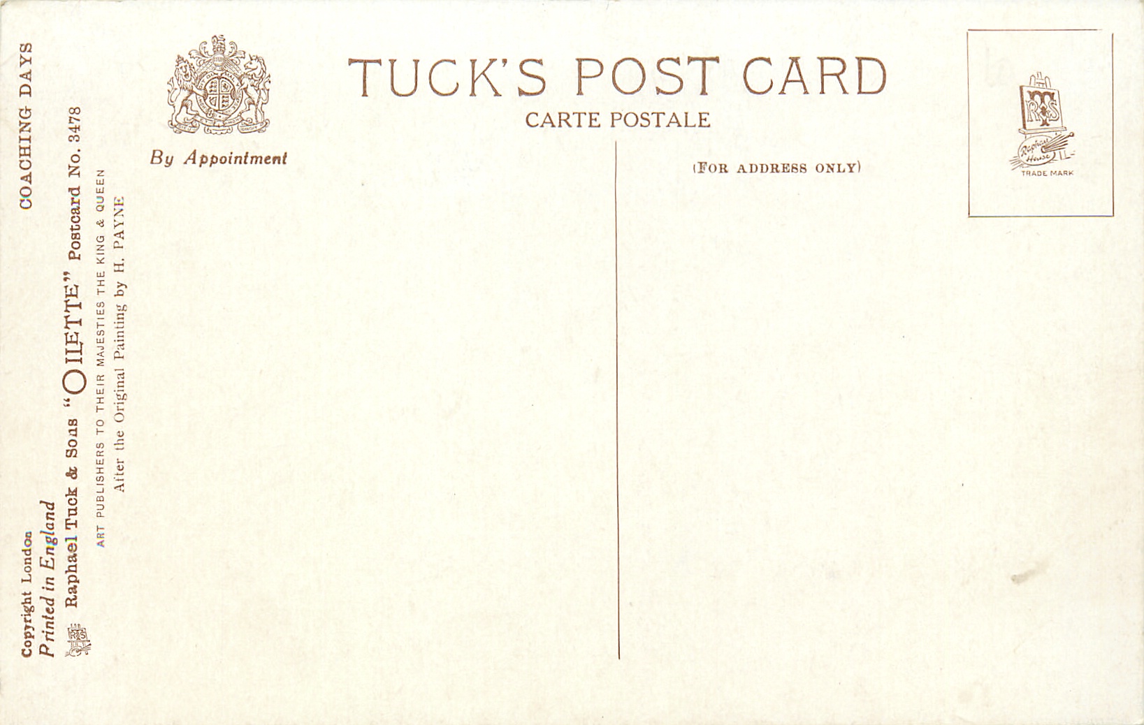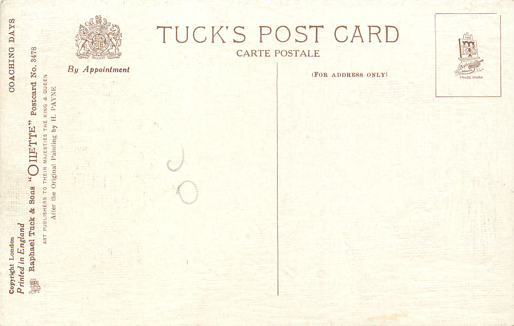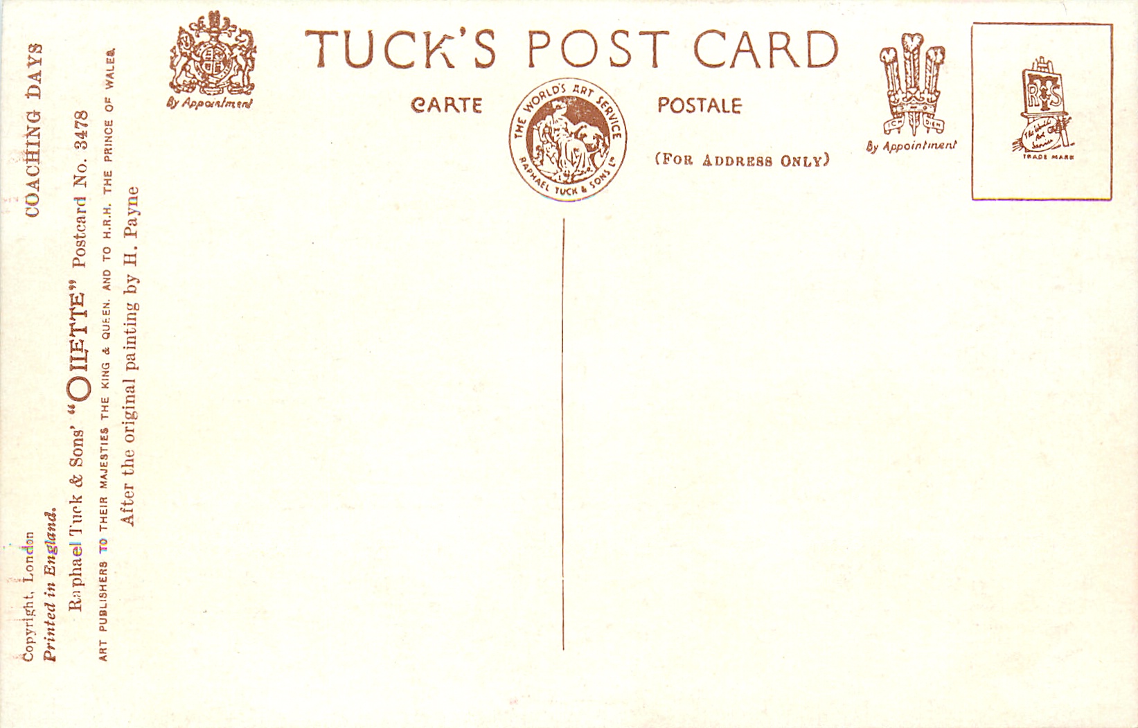 3 backs, COPYRIGHT LONDON, PRINTED IN ENGLAND, OILETTE or OILFACSIM with or w/o O.F. prefixes, come oilfscsim but not so trade-named, listed in 1927/1928 Postcard Catalogue