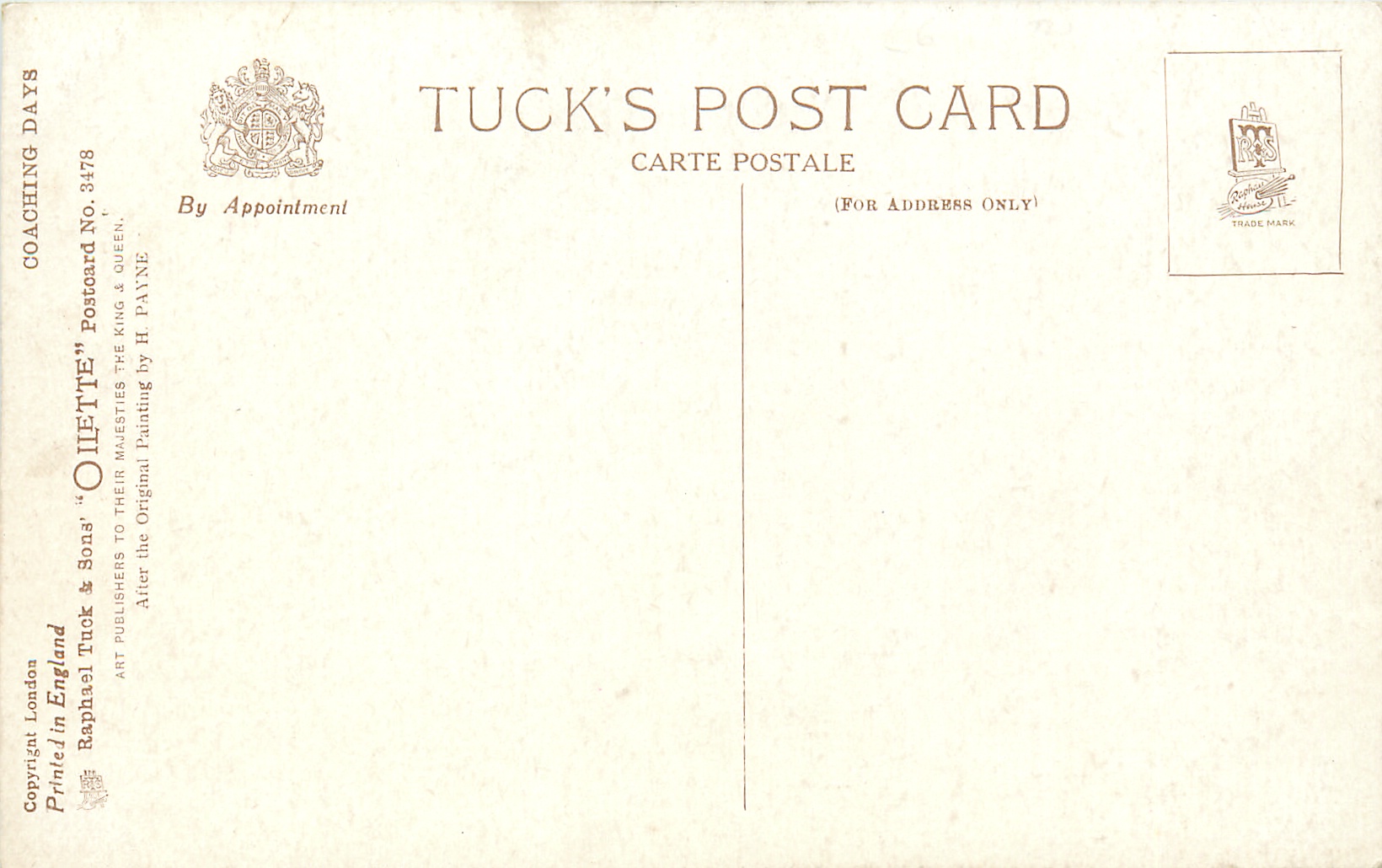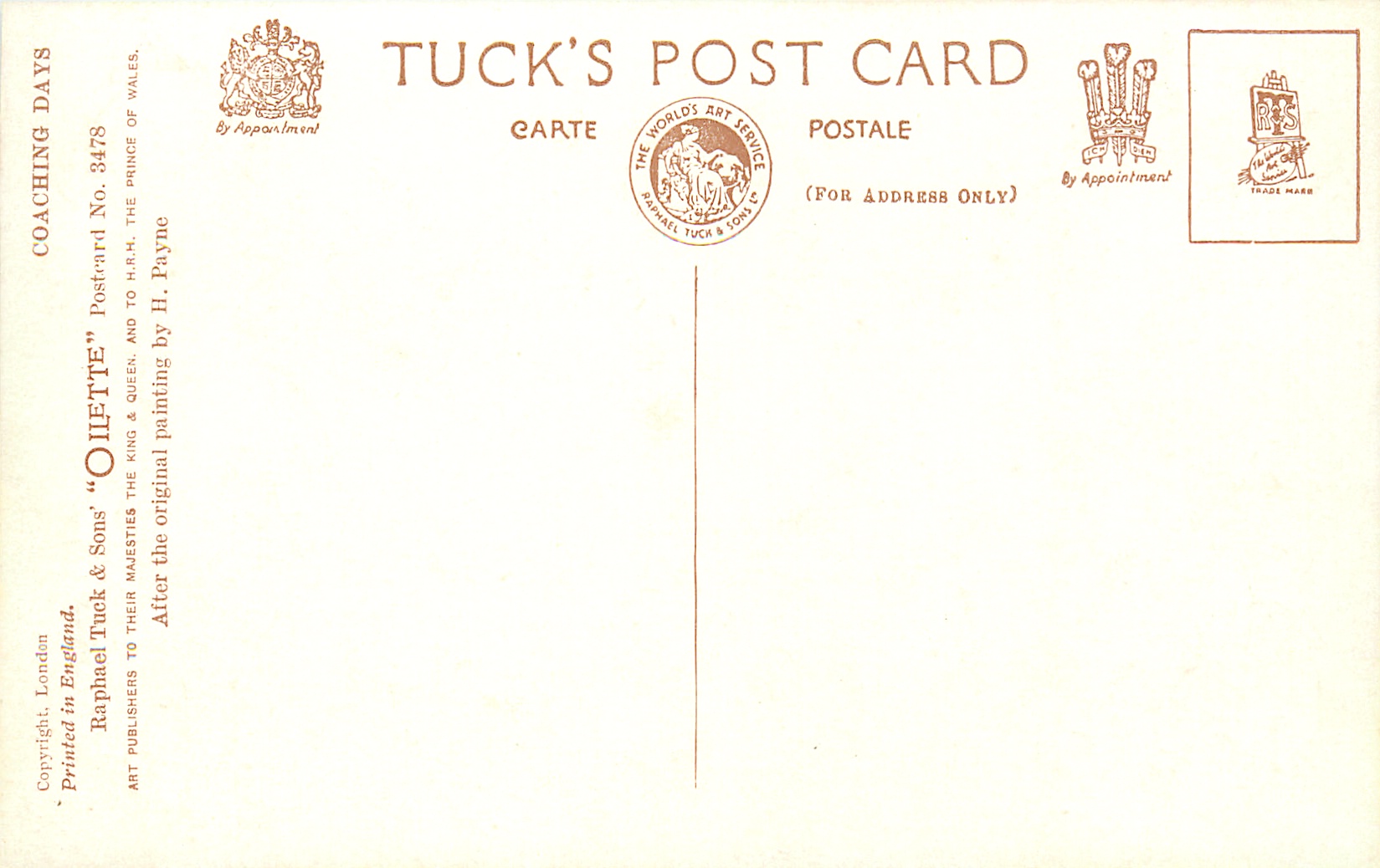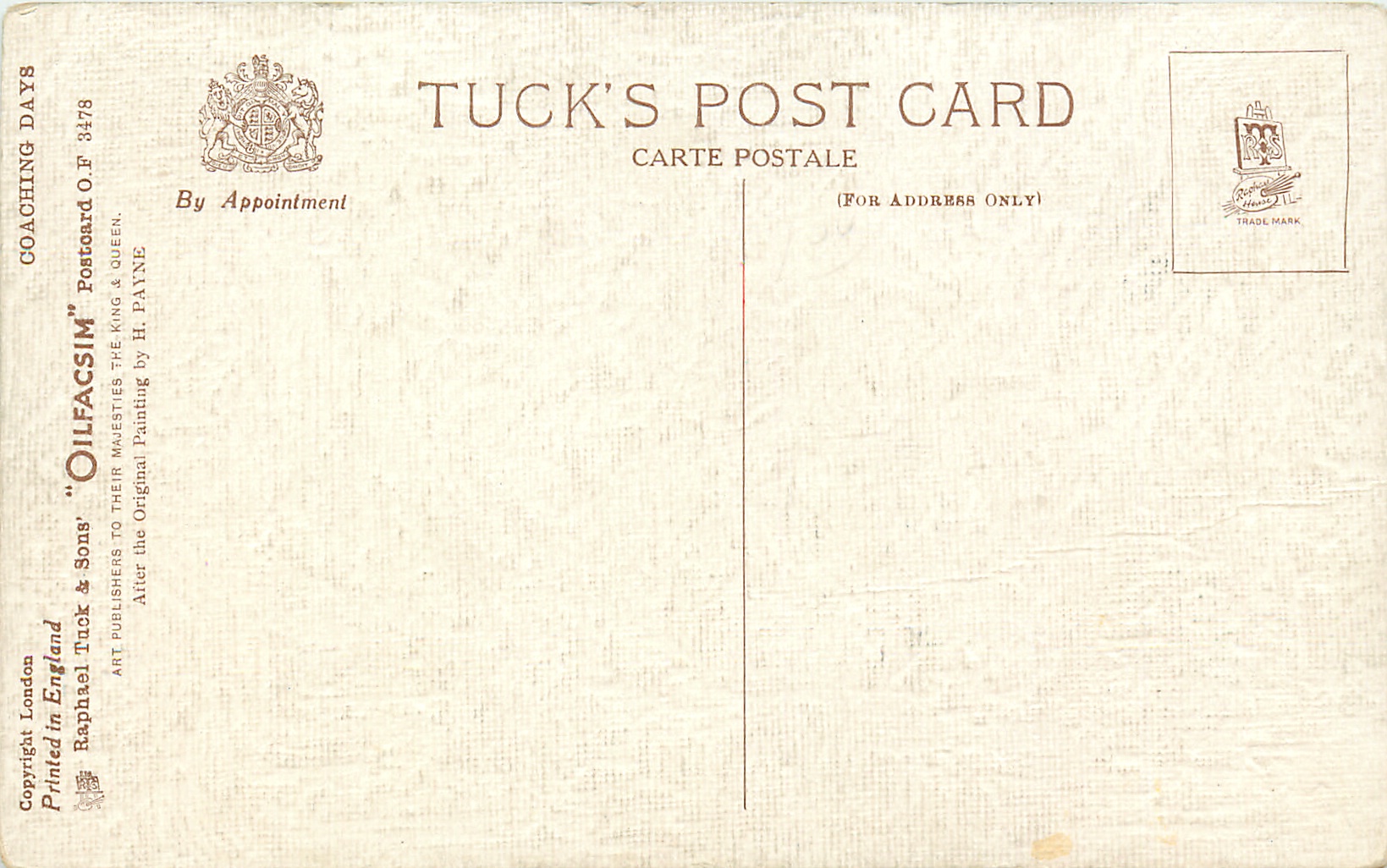 3 backs, COPYRIGHT LONDON, PRINTED IN ENGLAND, OILETTE or OILFACSIM with or w/o O.F. prefixes, come oilfscsim but not so trade-named, listed in 1927/1928 Postcard Catalogue