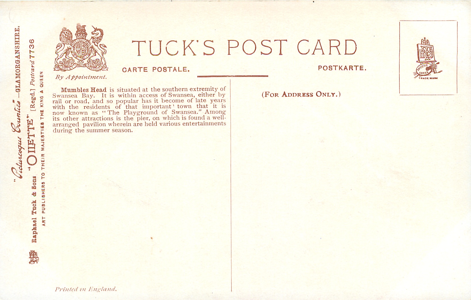OILETTE, PICTURESQUE COUNTIES, PRINTED IN ENGLAND, come oilfacsim but not so trade named, listed in 1908/1909 & 1911/1912 & 1930 POSTCARD Catalogues