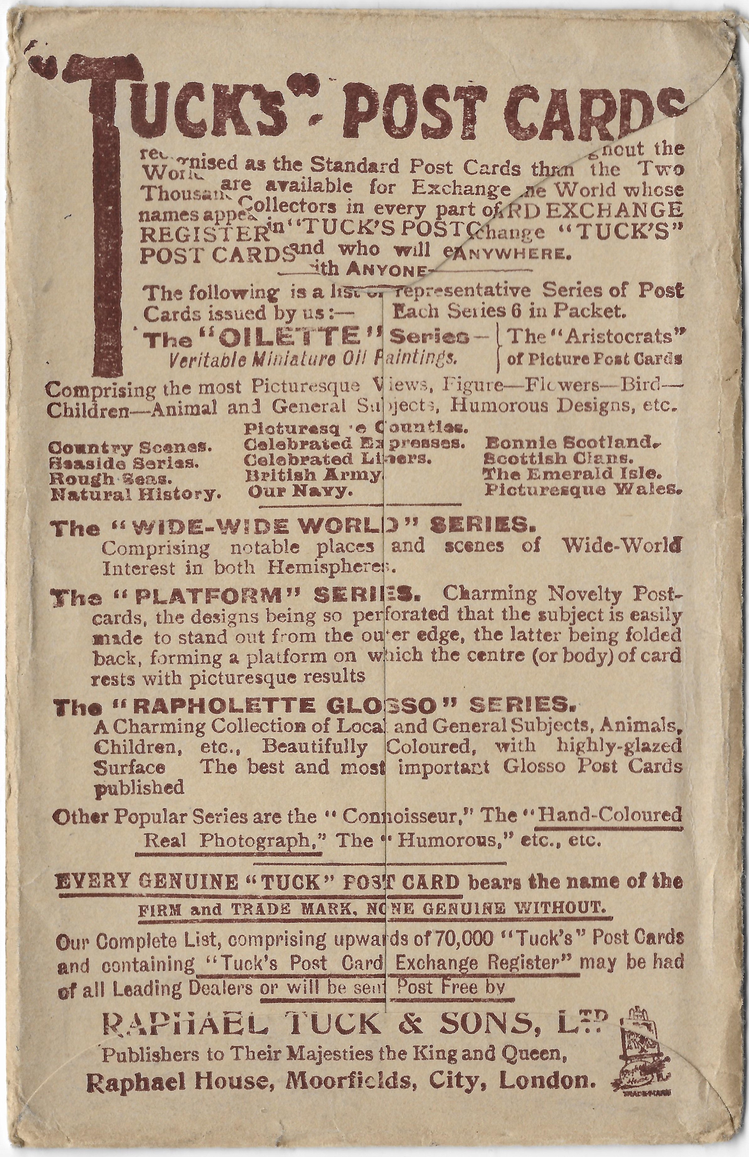 OILETTE, PRINTED IN ENGLAND or PRINTED IN THE UNITED KINGDOM, come oilfacsim but not so trade named, come opt. AMERICAN Y.M.C.A., 3 backs, listed in 1930 POSTCARD Catalogue
