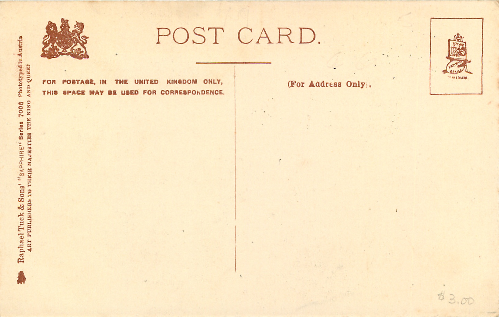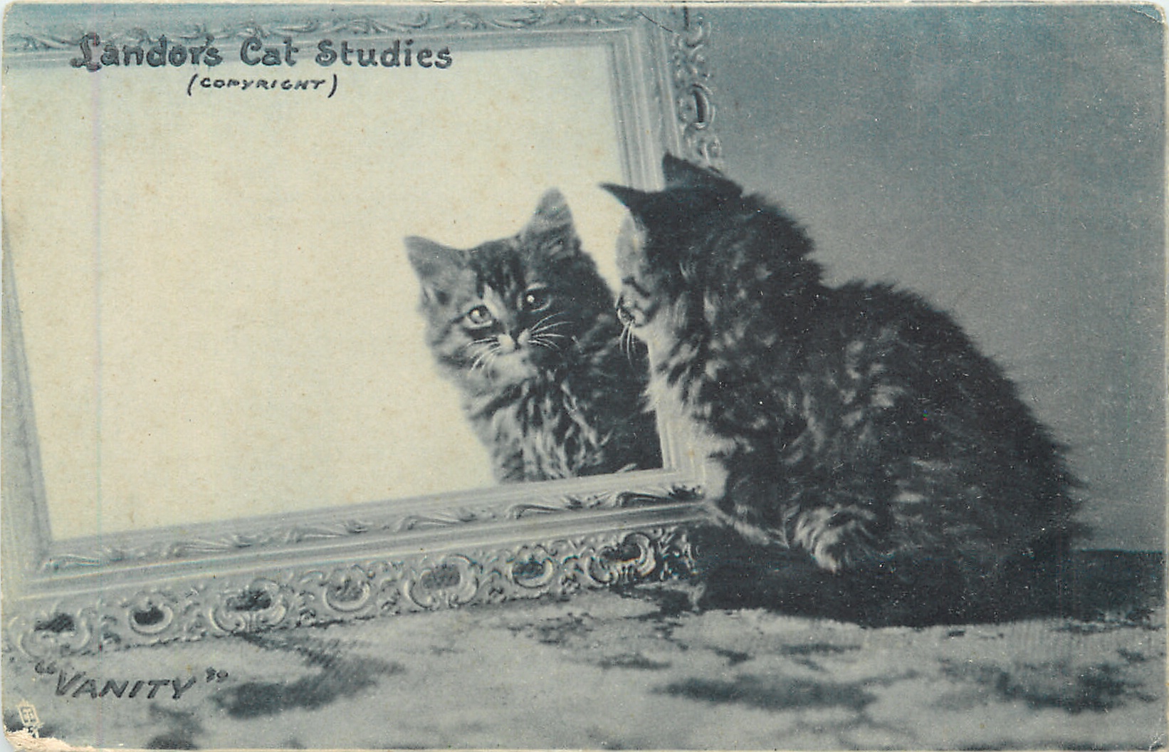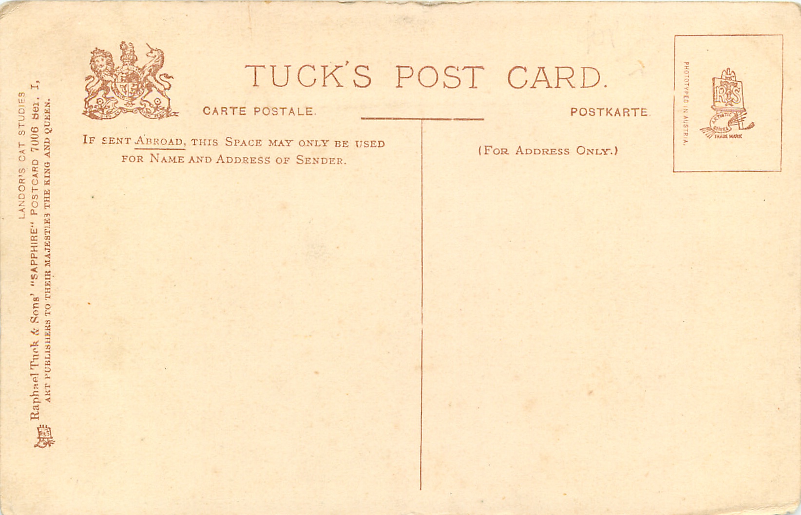 shades of blue/grey, SAPPHIRE, PHOTOTYPED IN AUSTRIA (in stamp box), 3 backs, comes w/o SER. I, most of these images come with French backs & titles, SERIE 252 & 409, many come in ART sets 862-865 & REAL PHOTOGRAPH 5089/93 & in PHOTOCHROME 6495/6496 CAT STUDIES