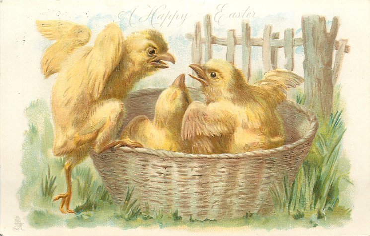 A HAPPY EASTER three chicks, two in a basket, one trying to get in