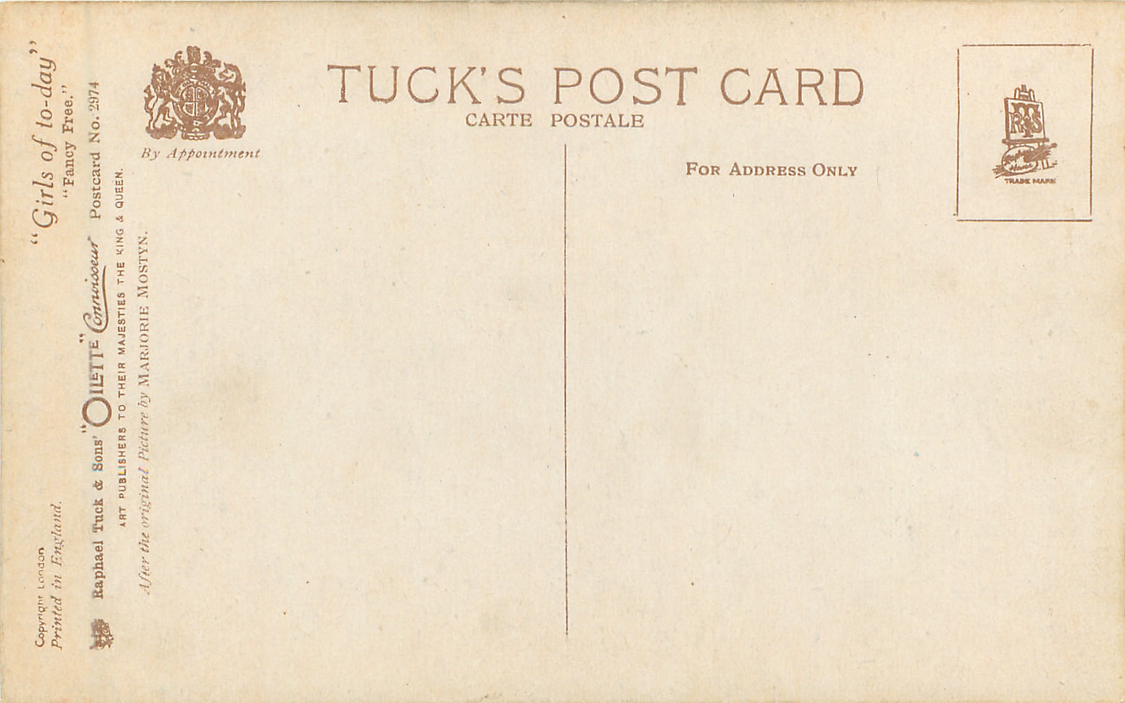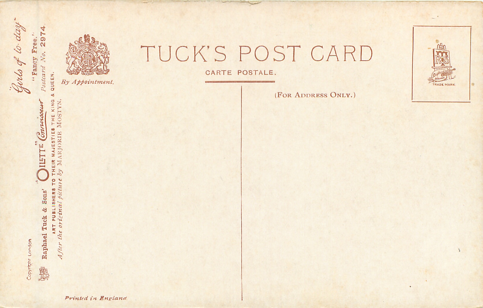 OILETTE CONNOISSEUR, PRINTED IN ENGLAND with or w/o COPYRIGHT LONDON AFTER THE ORIGINAL PICTURE BY MARJORIE MOSTYN