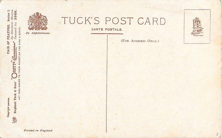 OILETTE CONNOISSEUR, COPYRIGHT LONDON, PRINTED IN ENGLAND, 3 backs, come with & without quote on bottom of each card, AFTER THE ORIGINAL DRAWING BY MARJORIE MOSTYN.. listed in1930 POSTCARD Catalogue
