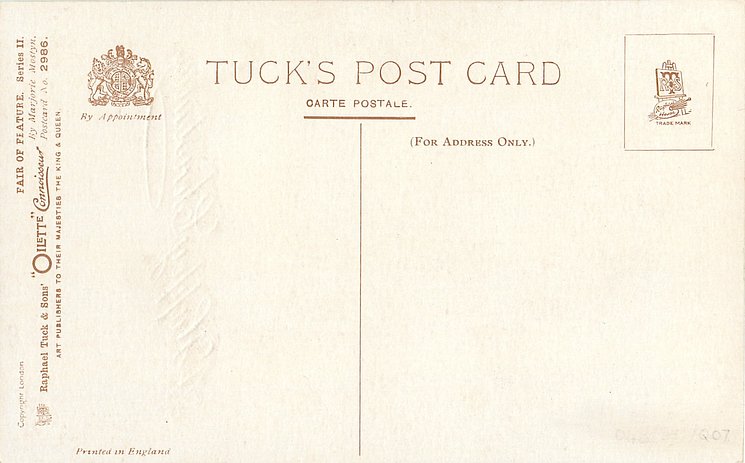 OILETTE CONNOISSEUR, COPYRIGHT LONDON, PRINTED IN ENGLAND, 3 backs, come with & without quote on bottom of each card, BY MARJORIE MOSTYN. listed in1930 POSTCARD Catalogue