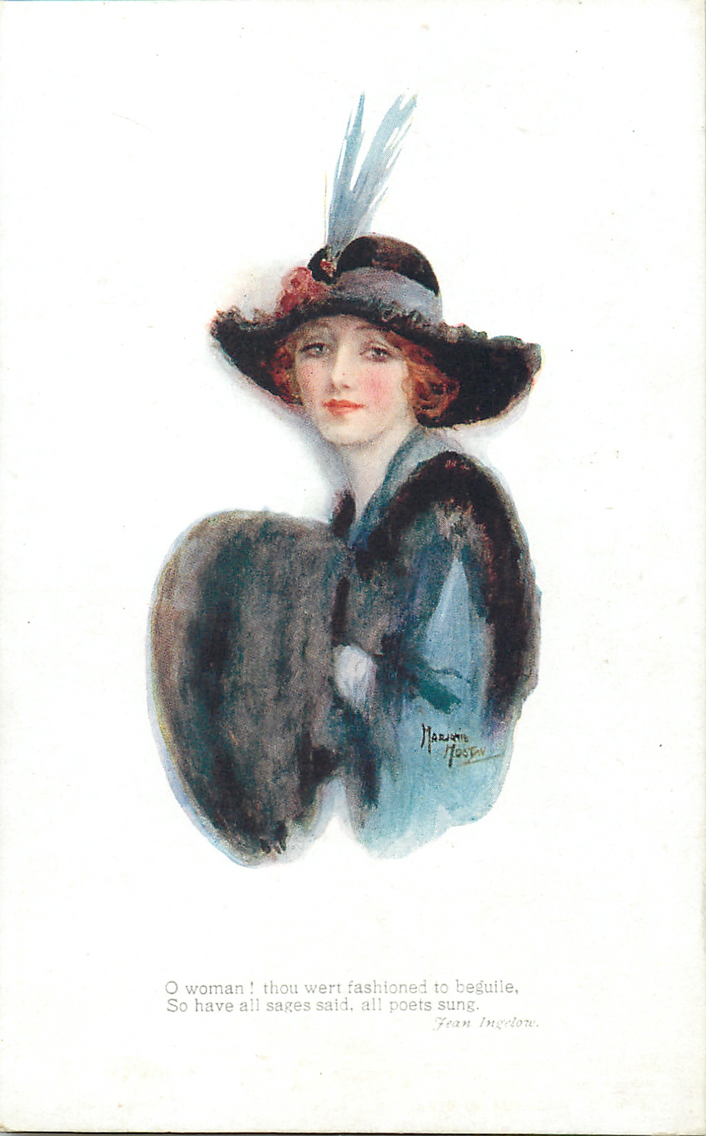 OILETTE CONNOISSEUR, COPYRIGHT LONDON, PRINTED IN ENGLAND, 3 backs, come with & without quote on bottom of each card, BY MARJORIE MOSTYN. listed in1930 POSTCARD Catalogue