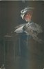 pretty girl in elegant hat, muff & flowing dress, sitting at table reading newspaper, facing left