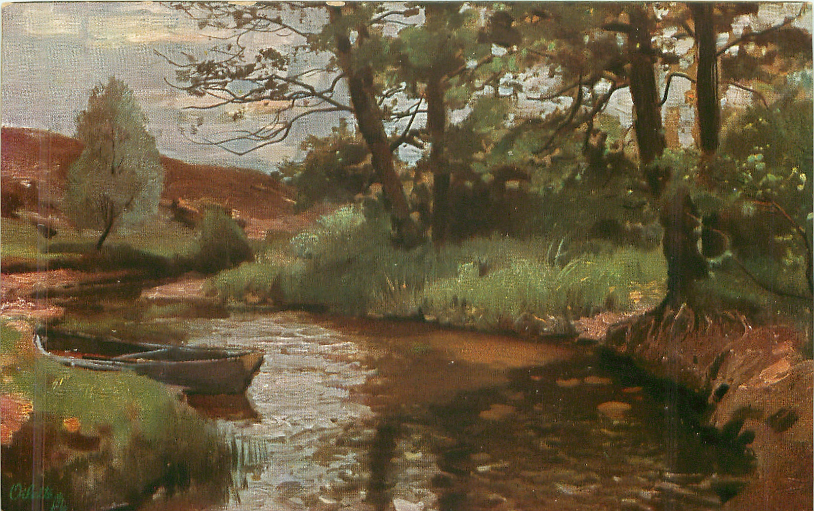 stream from back to front left, trees back, meadow & grassy bank right