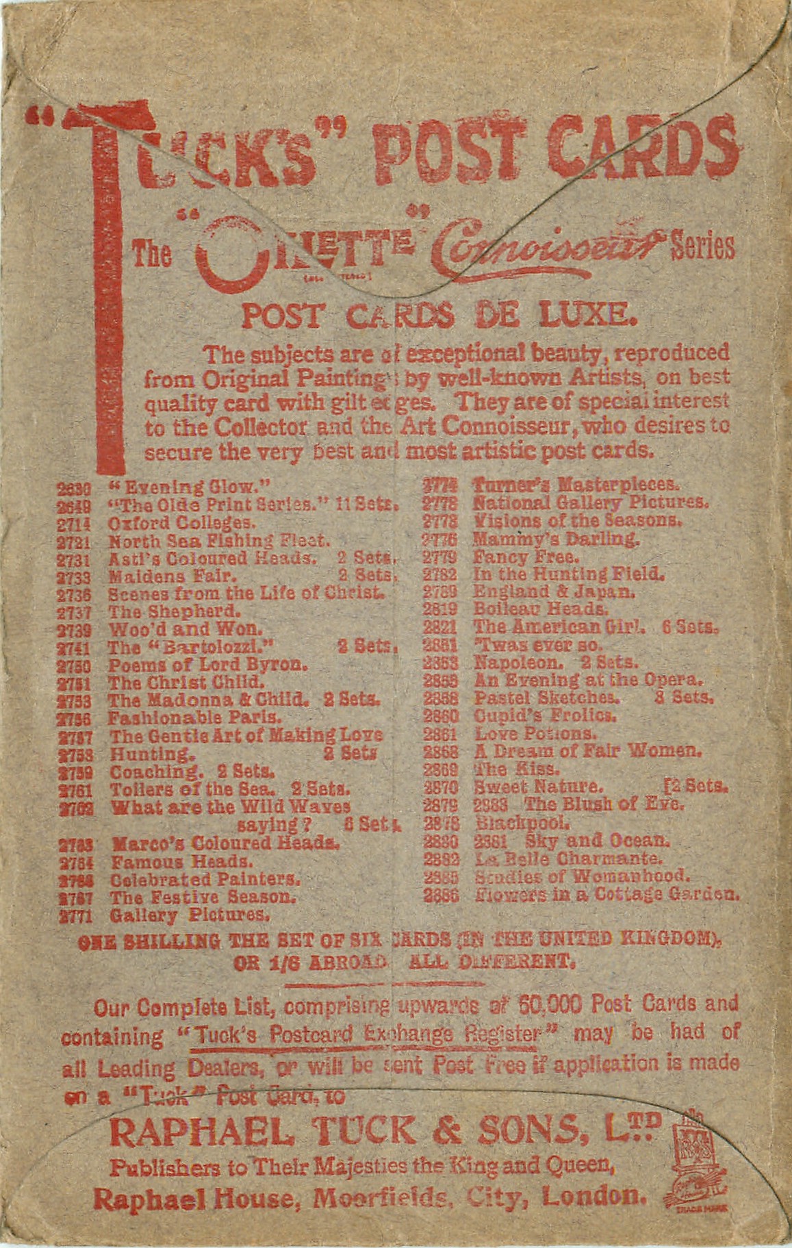 OILETTE CONNOISSEUR, PROCESSED IN BAVARIA, same images German backs OILETTE 824/825 DER DEUTSCHE WALDE, artists signature on some cards, usually indistinct, listed in TUCK'S TRAVELOGUES (USA?1905)