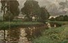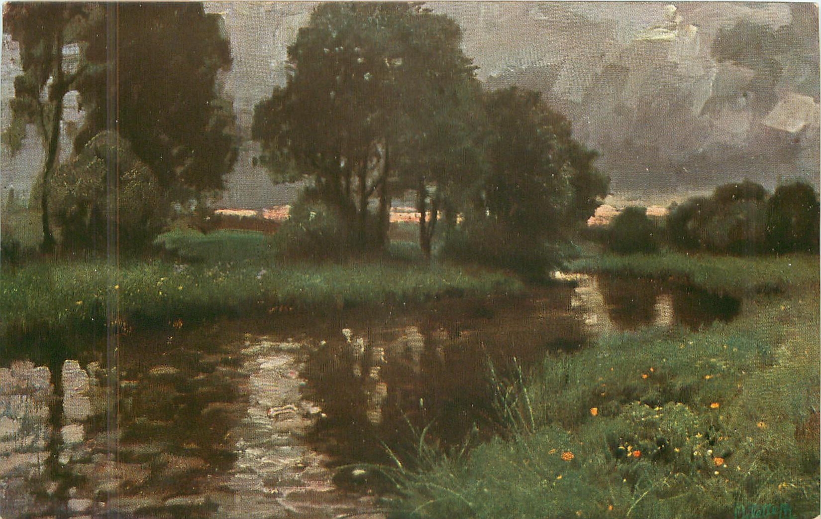 bank front left, water extending left from right front, two birch trees right bank, trees behind