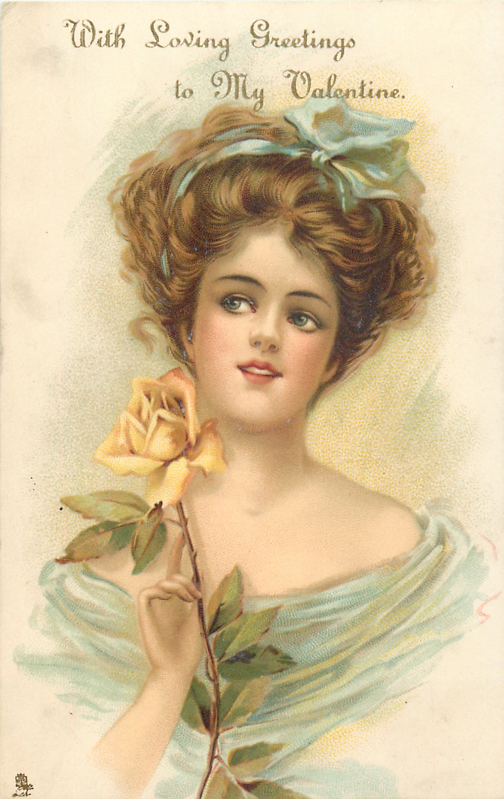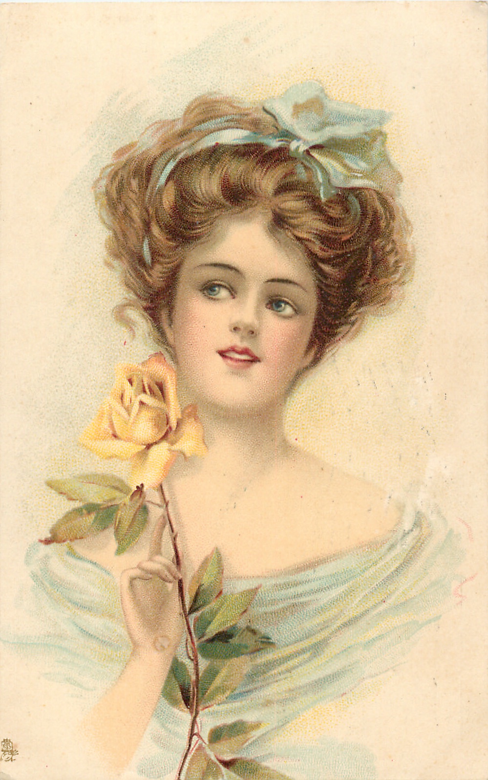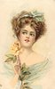 beauty faces front, looks up/left, holds yellow rose