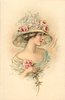 pretty woman in off shoulder blue dress, enormous hat trimmed with roses, single pink rose, looks right