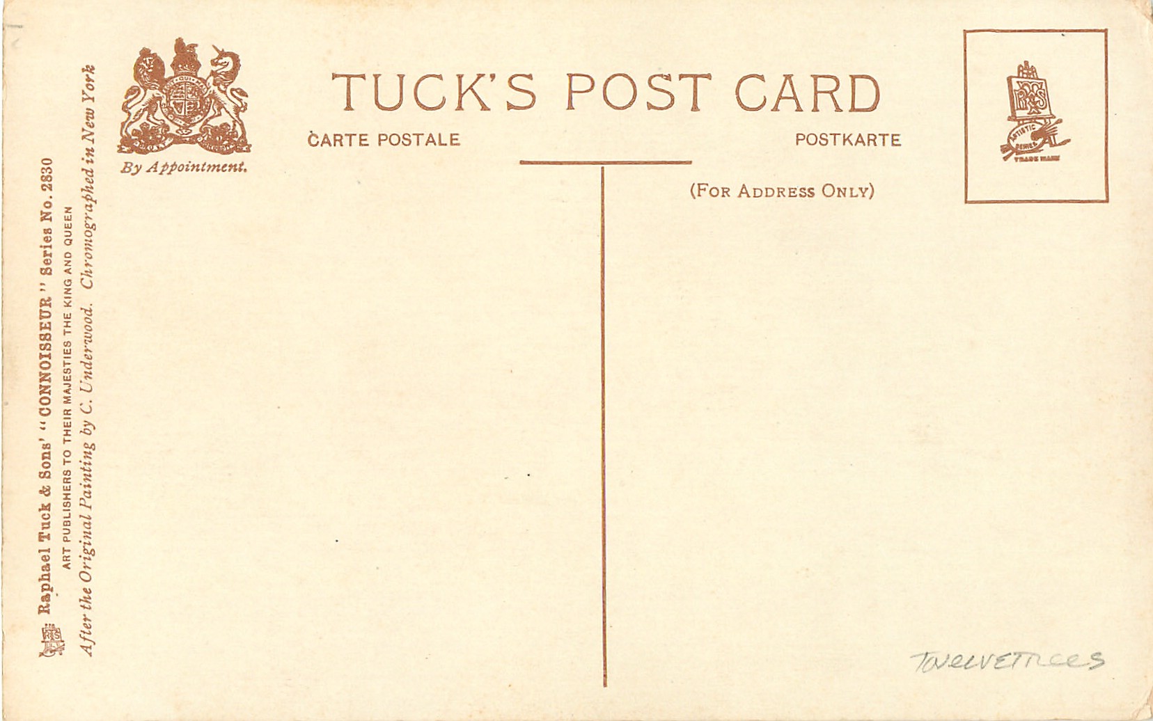 CONNOISSEUR, CHROMOGRAPHED IN NEW YORK, listed in 1911/1912 Postcard Catalogue, tuck error back inscription AFTER THE ORIGINAL PAINTING BY C. UNDERWOOD.,(likely Tuck artist error on back) not sold in U.S.A.