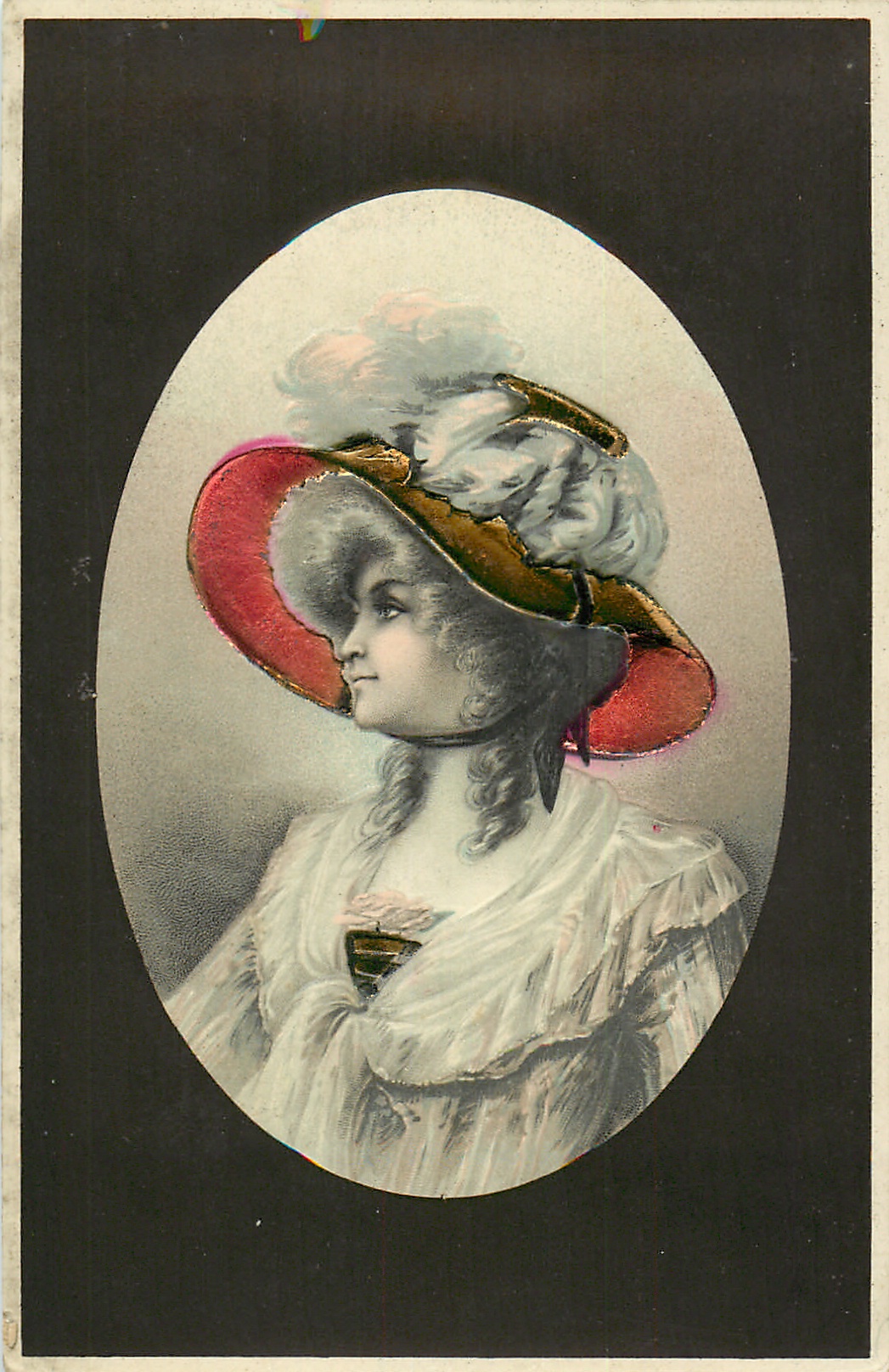 oval inset of woman facing partly left, looking left, pink enamel underside to brim of hat