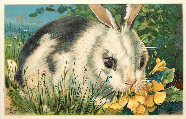 EASTER GREETINGS white rabbit with black patches, facing right, looking front, eating primroses