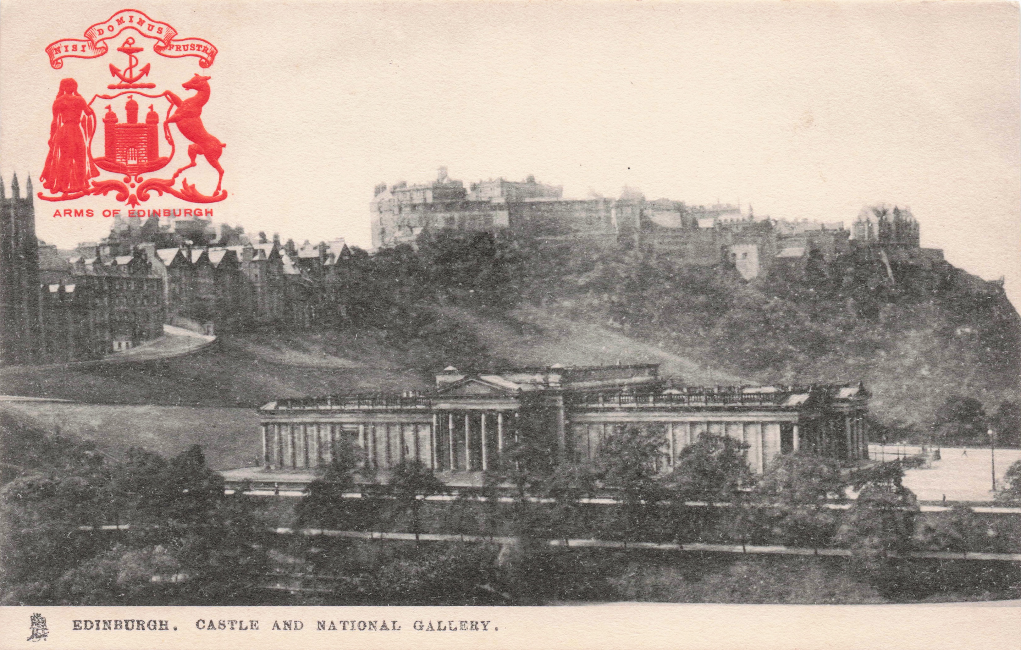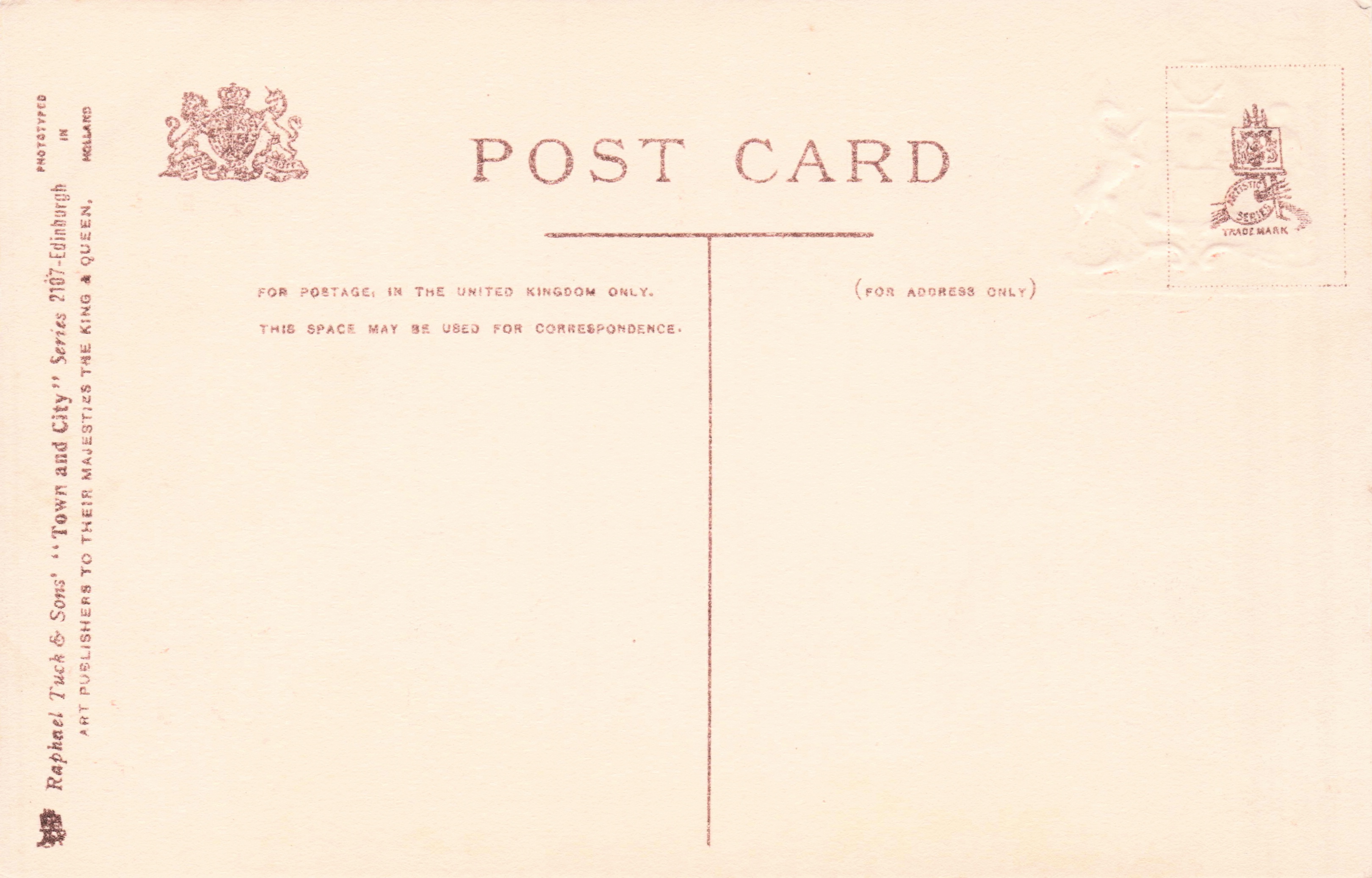 grey/black, TOWN AND CITY, PHOTOTYPED IN HOLLAND, comes opt in blue or red ARMS OF EDINBURGH & motto, listed in RAPHAEL TUCK & SONS' LD. CHRISTMAS & NEW YEAR 1904/1905 catalogue