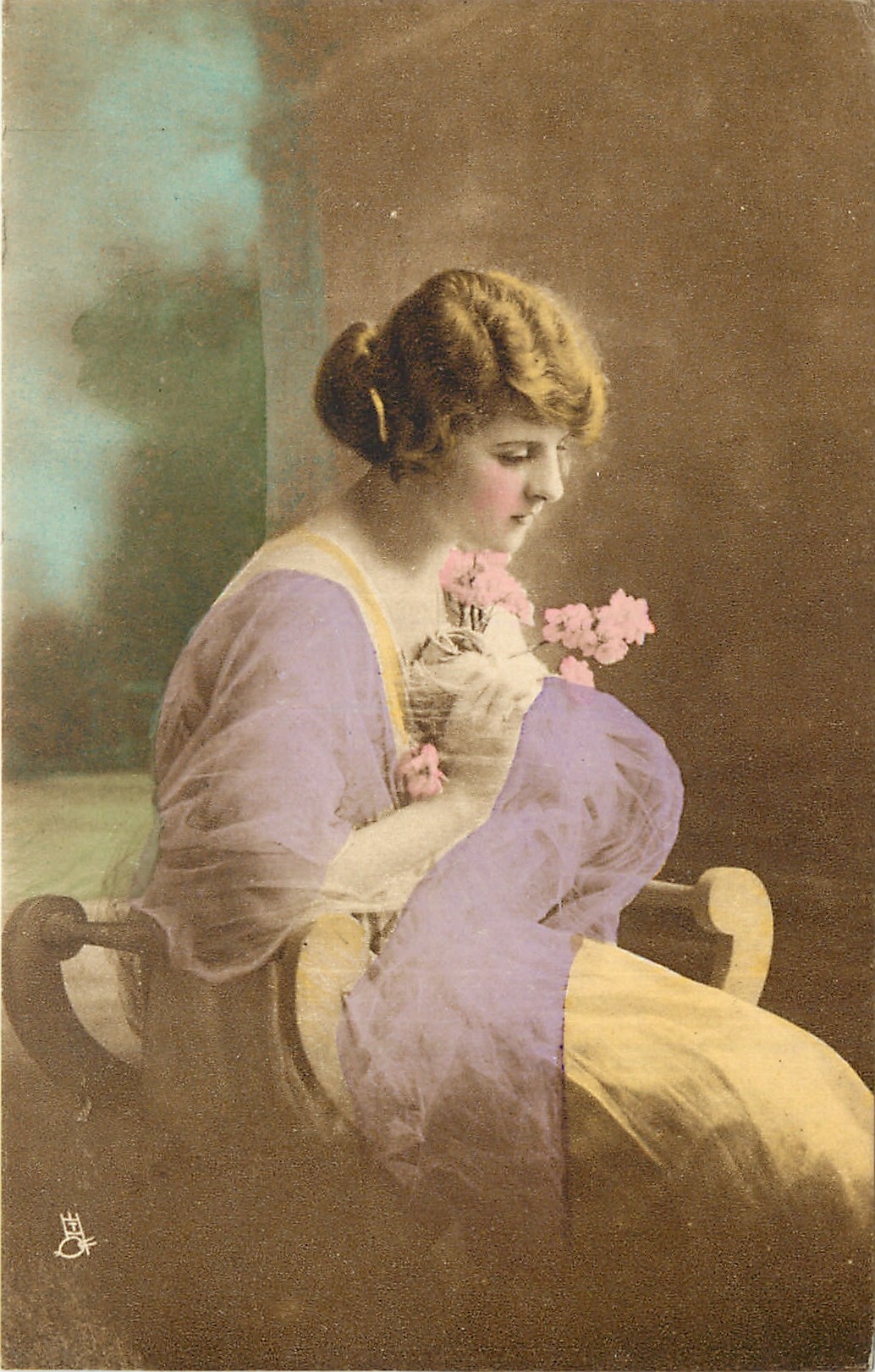 seated facing right, both hands hold flowers at her breast, looks down