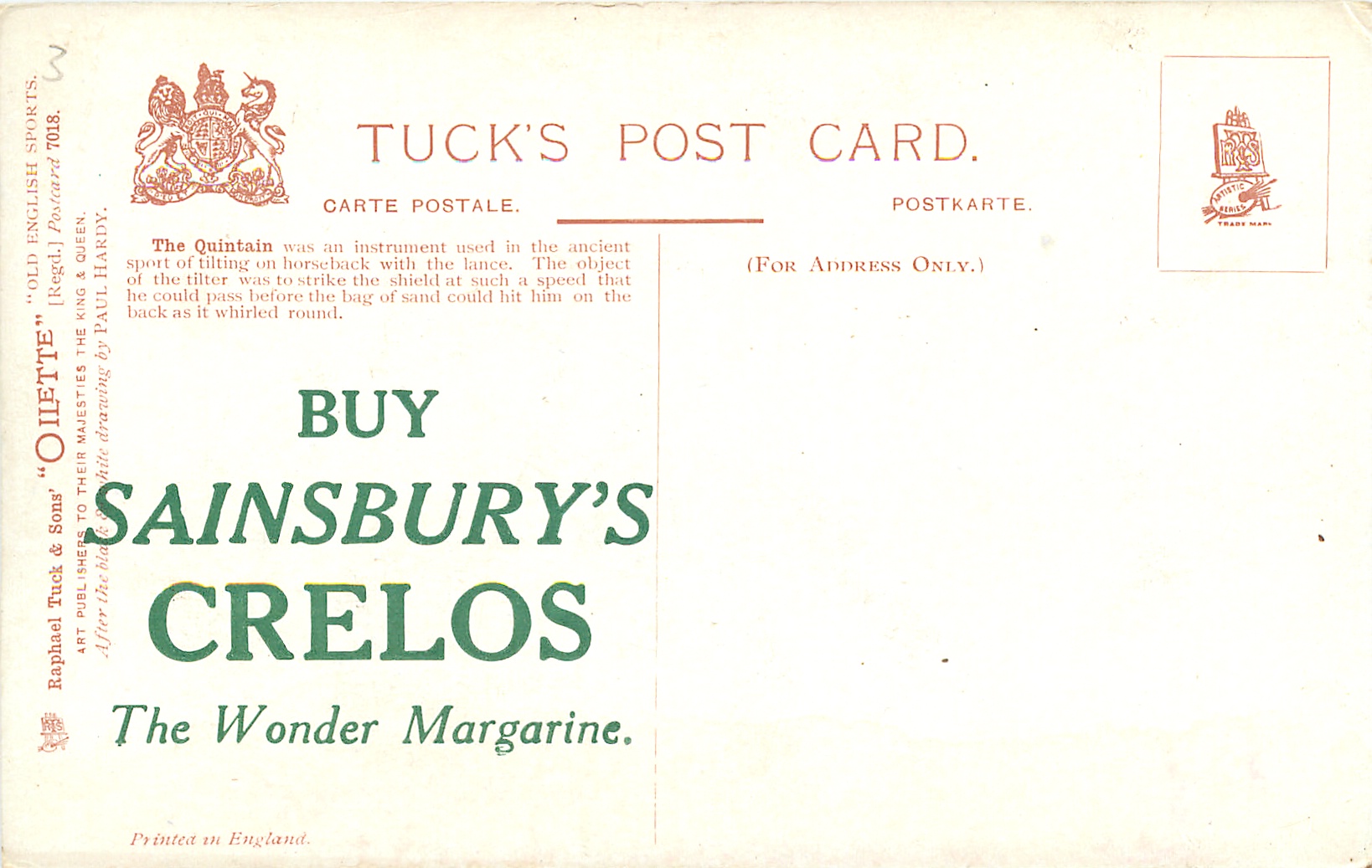 OILETTE, PRINTED IN ENGLAND, a set has BUY SAINBURY'S CRELOS THE WONDER MARGARINE on back, 2 backs, AFTER THE BLACK & WHITE DRAWING BY PAUL HARDY or R. TAYLOR, listed in 1908/1909 &1911/1912 & 1912/1913 &1913/1914 POSTCARD Catalogues
