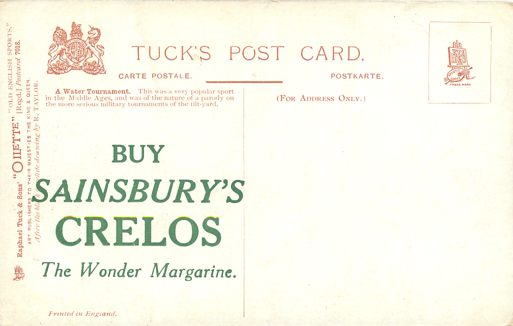 OILETTE, PRINTED IN ENGLAND, a set has BUY SAINBURY'S CRELOS THE WONDER MARGARINE on back, 2 backs, AFTER THE BLACK & WHITE DRAWING BY PAUL HARDY or R. TAYLOR, listed in 1908/1909 &1911/1912 & 1912/1913 &1913/1914 POSTCARD Catalogues