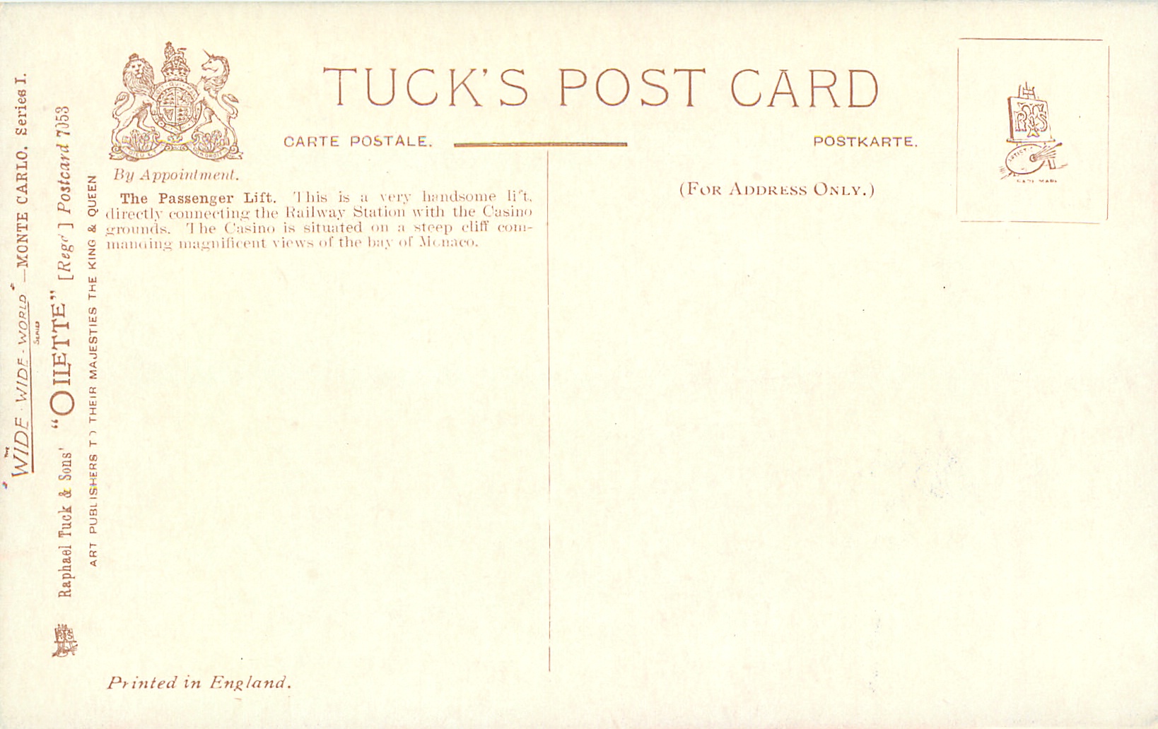 OILETTE, WIDE-WIDE-WORLD, PRINTED IN ENGLAND, 2 backs, listed in 1908/1909 & 1911/1912 & 1913/1914 Postcard Catalogues, same images French backs SERIE 7053 MONTE-CARLO I & III