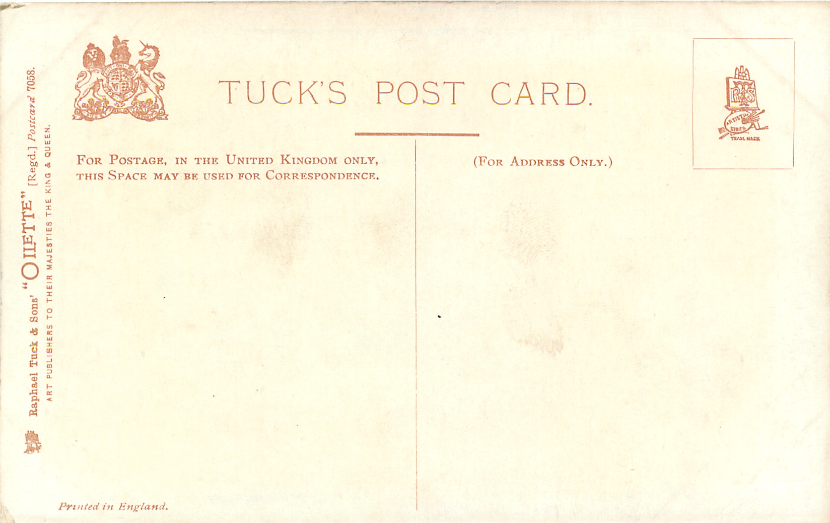 OILETTE, PRINTED IN ENGLAND, listed in 1911/1912 Postcard Catalogue
