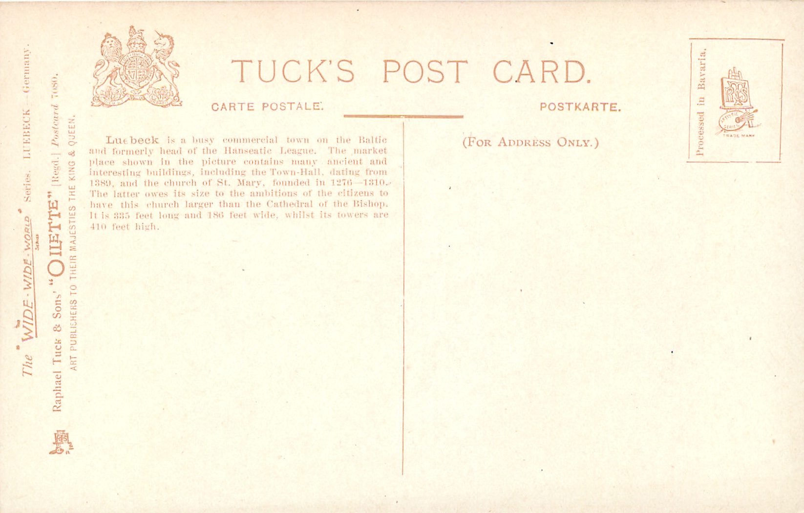 OILETTE WIDE-WIDE-WORLD, PROCESSED IN BAVARIA (in stamp box), listed in 1908/1909 & 1911/1912 & 1913/1914 Postcard Catalogues