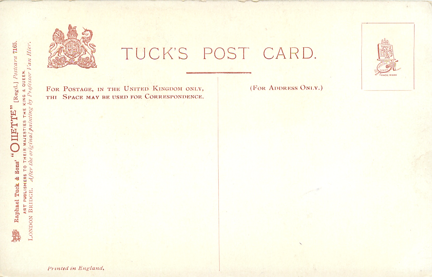 OILETTE, PRINTED IN ENGLAND, set title on packet but not on cards, signature of artist VAN HIER aka Professor Van Hier and Joachim Hiersch-Minerbi, AFTER THE ORIGINAL PAINTING BY PROFESSOR VAN HIER., listed in 1908/1909 Catalogue
