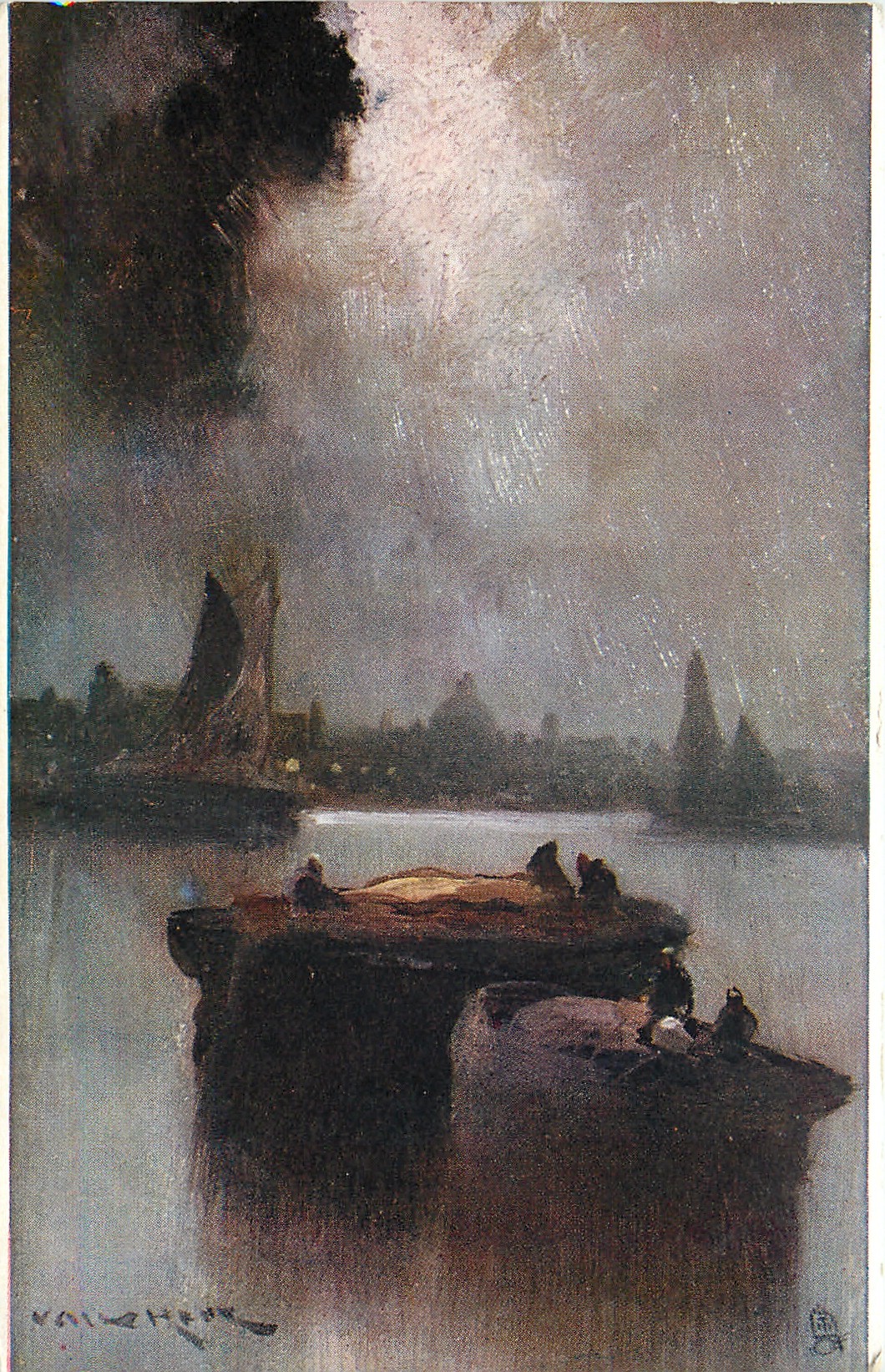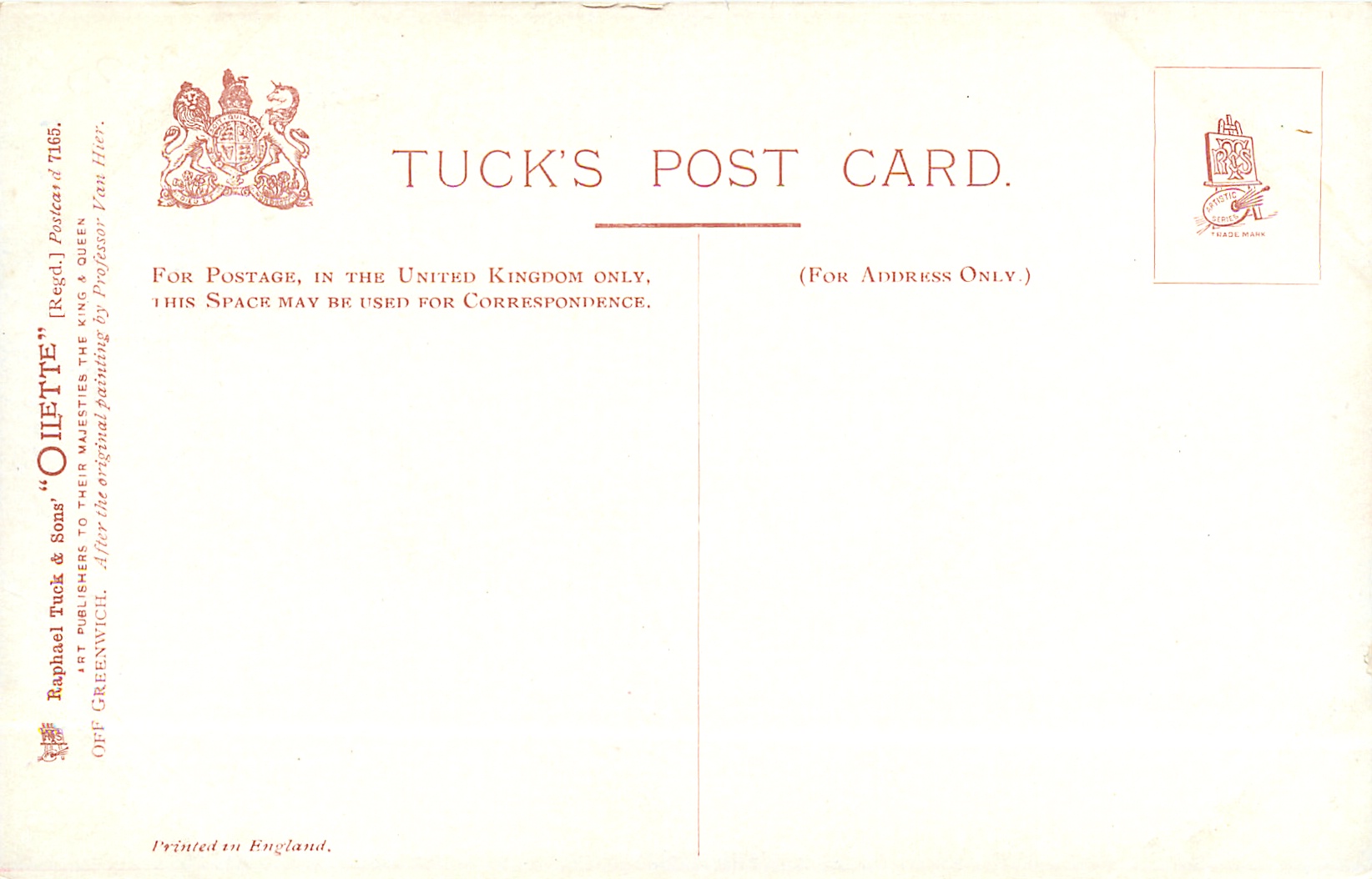 OILETTE, PRINTED IN ENGLAND, set title on packet but not on cards, signature of artist VAN HIER aka Professor Van Hier and Joachim Hiersch-Minerbi, AFTER THE ORIGINAL PAINTING BY PROFESSOR VAN HIER., listed in 1908/1909 Catalogue