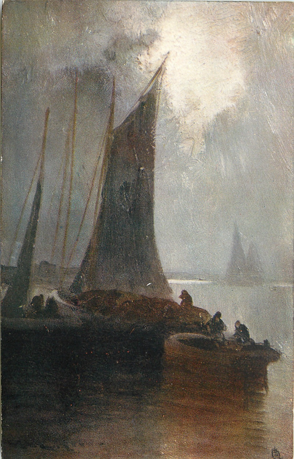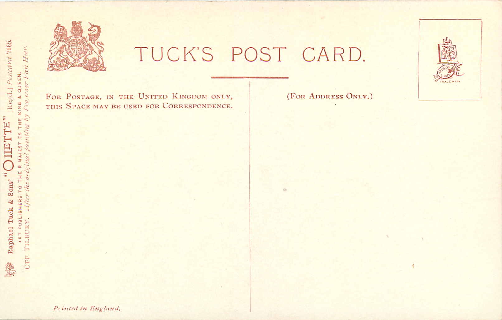 OILETTE, PRINTED IN ENGLAND, set title on packet but not on cards, signature of artist VAN HIER aka Professor Van Hier and Joachim Hiersch-Minerbi, AFTER THE ORIGINAL PAINTING BY PROFESSOR VAN HIER., listed in 1908/1909 Catalogue